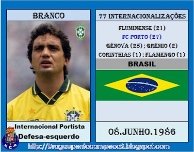Branco - Internacional E5: Representou a selecção principal do Brasil por 77 vezes (21 pelo Fluminense, 27 pelo FC Porto, 25 pelo Génova, 2 pelo Grémio, 1 pelo Corinthias e 1 pelo Flamengo).