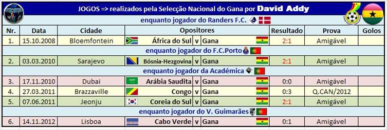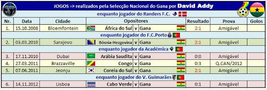 David Addy - Internacional E46: Envergou a camisola da Selecção nacional do Gana por 6 ocasiões (1 pelo Randers FC, 1 pelo FC Porto, 3 pela Académica e 1 pelo V. Guimarães). A sua estreia pela equipa principal do seu país aconteceu em 15 de Outubro de 2008, em Bloemfontein, no jogo amigável entre as selecções da África do Sul e do Gana, que terminou com a vitória dos Bafana-Bafana, por 2-1.