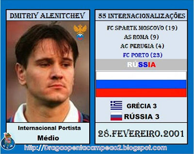 Dmitriy Alenitchev - Internacional E26: Vestiu a camisola da Selecção nacional da Rússia por 55 vezes (19 pelo FC Spartak Moscovo, 9 pelo AS Roma, 4 pelo AC Perugia e 23 pelo FC Porto). A sua estreia teve lugar em Ta'Qali, a 9 de Fevereiro de 1996, num jogo a contar para o Rothmans Torneio Internacional, realizado na capital de Malta, tendo a Islândia como adversário.