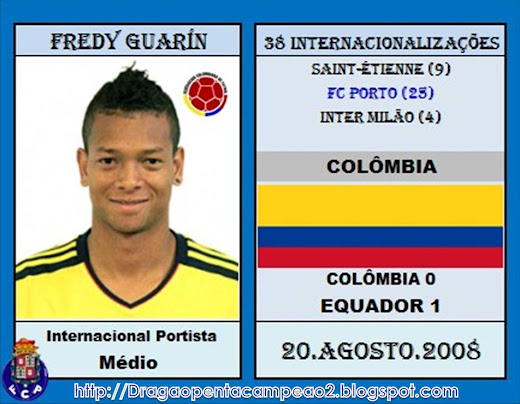 Fredy Guarín - Internacional E42: Envergou a camisola da Selecção nacional da Colômbia por 38 vezes (9 pelo Saint-Étienne, 25 pelo FC Porto e 4 pelo Inter de Milão). A sua estreia aconteceu em 25 de Maio de 2006, em Nova York, no jogo amigável entre as Selecções principais do Equador e da Colômbia, que terminou com um empate de 1-1.