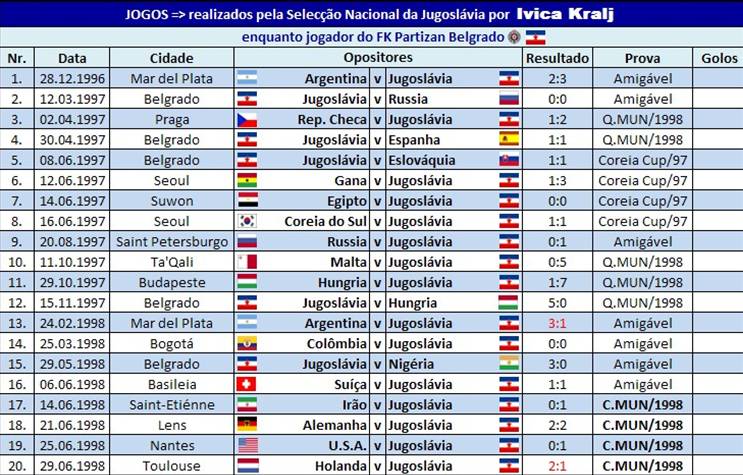 Ivika Kralj - Internacional E22: Vestiu a camisola da Selecção nacional da Jugoslávia por 42 vezes (20 pelo FK Partizan de Belgrado, 5 pelo FC Porto, 1 pelo FK Radnicki e 16 pelo PSV Eindhoven). Estreou-se em 28 de Dezembro de 1996, em Mar del Plata, num jogo amigável entre a Argentina e a Jugoslávia, com vitória da selecção europeia por 3-2.