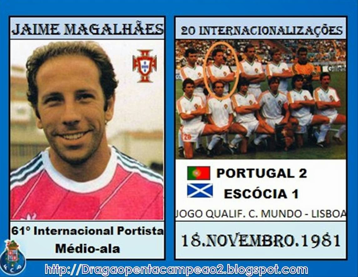 Jaime Magalhães - 61º internacional: 20 vezes internacional, estreou-se na equipa das quinas em 18 de Novembro de 1981, com vitória portuguesa por 2-1, frente à Escócia, em Lisboa, em jogo de fase de apuramento para o Campeonato do Mundo.