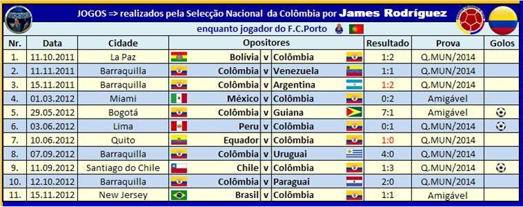 Fontes: Fifa.com; Worlfootball.net; Transfermarkt.co.uk;FCF.com.co (Federação Colombiana Futebol) e base de dados actualizados de Rui Anjos.