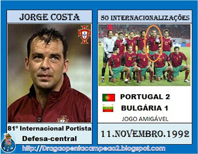 Jorge Costa - 81º internacional: Carlos Queiroz, seu seleccionador nas camadas jovens, foi o responsável pela sua primeira chamada à Selecção A, em 11 de Novembro de 1992, num jogo particular realizado em Paris, em que Portugal derrotou a Bulgária por 2-1. Dez anos depois, quando resolveu dizer adeus à equipa das quinas, após o Mundial da Coreia do Sul/Japão, Jorge Costa tinha entrado no restrito grupo de jogadores que atingiram as 50 internacionalizações (43 das quais pelo FC Porto e as restantes 7 pelo Charlton Athletic). Estivera presente na fase final do Euro/2000 e do Mundial/2002, onde formou dupla excepcional com Fernando Couto, reconhecidamente considerada como uma das mais fortes do Mundo. Só uma arreliadora lesão e a demorada recuperação o impediram de ter estado igualmente na fase final do Euro/1996.