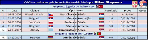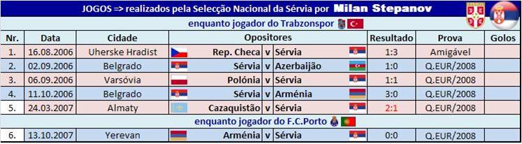 Milan Stepanov - Internacional E37: Envergou a camisola da Selecção nacional da Sérvia por 6 vezes (5 pelo Trabzonspor e 1 pelo FC Porto). A sua estreia na selecção principal aconteceu em 16 de Agosto de 2006, na cidade checa de Uherske Hradist, num jogo amigável entre as selecções da Rep. Checa e a Sérvia, que terminou com a vitória dos sérvios por 3-1.