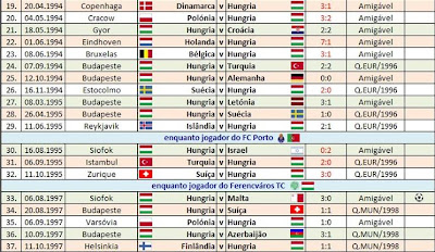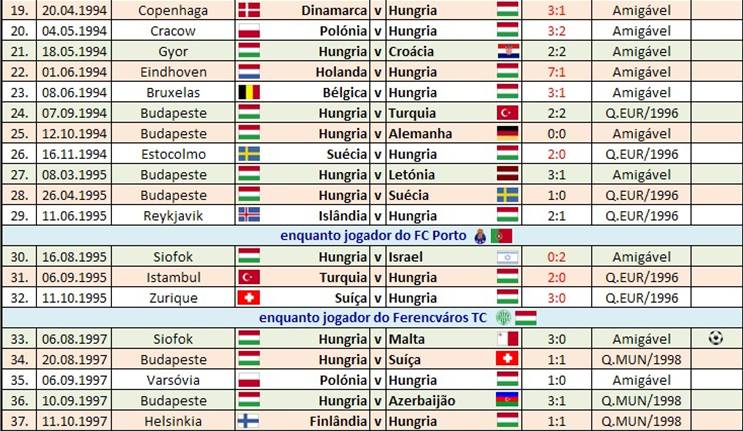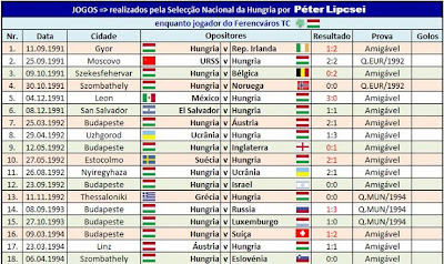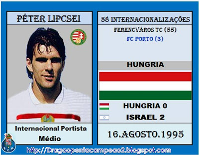 Péter Lipcei - internacional E11: Representou a Selecção nacional principal da Hungria por 58 vezes (55 pelo Ferencváros TC e 3 pelo FC Porto). O jogo de estreia aconteceu em 11 de Setembro de 1991, num jogo particular disputado na cidade húngara de Gyor, onde a Selecção da casa recebeu a sua congénere da Rep. da Irlanda, com o resultado desfavorável de 2-1. Enquanto jogador do FC Porto, fez apenas três encontros, o primeiro dos quais, em 16 de Agosto de 1995, em Siofok, no Hungria-Israel, de carácter amigável, com derrota húngara por 0-2.