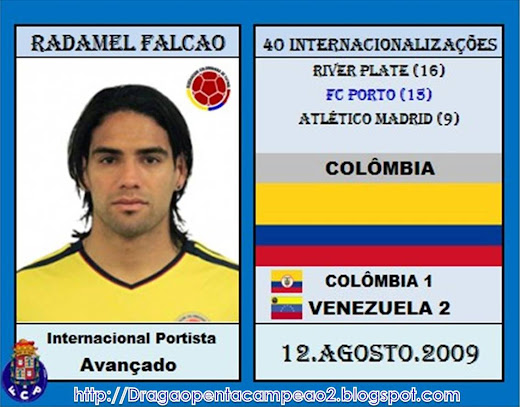 Radamel Falcao - Internacional E43: Envergou a camisola da Selecção nacional da Colômbia por 40 ocasiões (16 pelo River Plate, 15 pelo FC Porto e 9 pelo Atlético de Madrid). O dia 8 de Fevereiro de 2007 é a data da sua estreia na selecção principal do seu país, que aconteceu na cidade de Cucutá, onde a Colômbia recebeu a sua congénere do Uruguai, em jogo amigável que terminou com a derrota colombiana por 1-3.