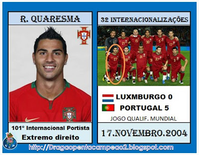 Ricardo Quaresma - 101º internacional: Conta, até este momento, com 32 internacionalizações (1 pelo Sporting, 22 pelo FC Porto, 2 pelo Inter de Milão e 7 pelo Besiktas). A estreia aconteceu em 10 de Junho de 2003, num amigável contra a Bolívia, ainda como jogador do Sporting. Foi ao serviço do FC Porto que voltou a envergar a camisola das quinas, em 17 de Novembro de 2004, no Luxemburgo-Portugal, jogo de qualificação para o Mundial/2006, com expressiva vitória portuguesa por 5-0.