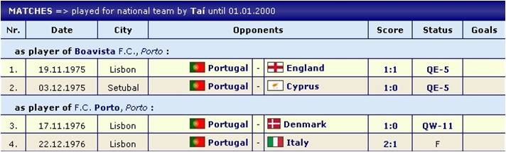 António Carlos Laranjeira (Taí) - 50º internacional: Vestiu a camisola da Selecção Nacional por 4 vezes (duas pelo Boavista e duas pelo FC Porto), com estreia a 19 de Novembro de 1975, frente à Inglaterra. Em 17 de Novembro de 1976, concretizou a sua 3ª internacionalização, primeira como atleta do FC Porto, contra a Dinamarca, em Lisboa, num jogo de qualificação para o Campeonato do Mundo e com a vitória portuguesa por 1-0.