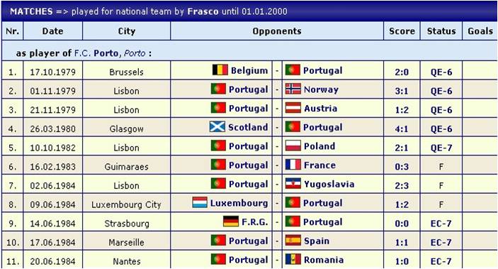 António Frasco - 56º internacional: 23 vezes internacional, estreou-se pela Selecção Nacional em 17 de Outubro de 1979, contra a Bélgica em Bruxelas, em jogo da fase de apuramento para o Campeonato da Europa, com derrota portuguesa por 2-0.